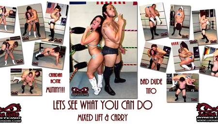 Mutiny vs bad dude tito ~ mutiny is constantly looking to satisfy the "pay attention to me” itch and this time sets her sights on the infamous bad dude pro wrestler tito escondido, a man who arrogantly loves to put women in their place. she measures him up, deciding that he may be man enough for her, but lets face it, any mans attention is enough for this slut. she interrupts his workout set and vies to get his undivided attention. after a few words are exchanged, he gives into the slutty siren and gives her a few minutes of his time. she wants to show him that sluts can be strong girls too and proceeds to pick him up firemans carry style. the competition is on as bad dude will not let some canadian cunt show him up! they take turns in various lifts around the ring – piggyback, over the shoulder, and of course mutiny’s favorites the piledriver and powerbomb positions putting her cunt just where she craves it, right in his face! but in the end there can only be one winner and of course one victim! buy lucha girls wrestlings “1698-lift carry gone wrong – mixed challenge – and see who is victorious and who suffers the ultimate defeat