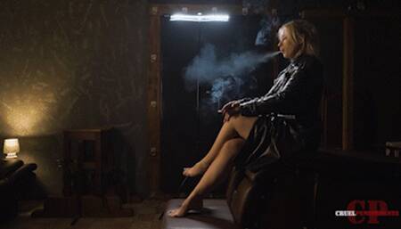 Mistress anette climbed onto the caning bench, barefoot and wearing only her black leather coat, the cool leather contrasting with her warm skin. she sat down, lit a cigarette, and began to play with the smoke, exhaling it out of her mouth and inhaling it back through her nose, her eyes unfocused. under the single studio lamp, she silently smoked, the room filling with the scent of tobacco, before she crushed the butt in her black ashtray. features: smoking, fetish, face fetish, barefoot, foot fetish, asmr, leather coat, femdom