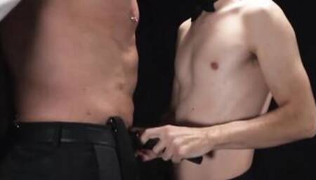 Posted on September 16, 2023Slim pale twink doggy fucked by ultra muscular tattooed dude Muscular and buff dude with nipple rings fucks his young pale twink slave from behind really hard.