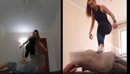 We present to your attention the young princess eliza. 18-year-old fashion model, beautiful and very sweet. although, there are sadistic notes in the character, so if you make her angry, you will regret it :))) in this video, eliza comes to the gym to work out. but chauvinist johnny tells her that girls don’t belong in the gym, their place is in the kitchen. eliza does not agree with such views and they have a conflict.the girl quickly and without problems beat the man, kicks him with her feet in sneakers, and then barefoot.determined to humiliate johnny even more, elise ties him up and watches him crawl helplessly at her feet. this young beauty then turns johnny’s face into a stand for her sweaty feet.it all ends with johnny lying near the chair under eliza’s feet. and the girl sits in a chair and thinks about what to do with him next. this is the first part of the video. here eliza comes to the gym, johnny tries to kick her out and tells her nasty things. the girl kicks the man with her sneakers, knocks him to the floor, kicks him and steps on him.then the girl takes off her sneakers and then continues the educational process barefoot. the girl kicks the arrogant man and steps on him with her feet. the videos were filmed with four cameras.the video has english subtitles.