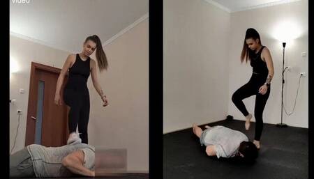 We present to your attention the young princess eliza. 18-year-old fashion model, beautiful and very sweet. although, there are sadistic notes in the character, so if you make her angry, you will regret it :))) in this video, eliza comes to the gym to work out. but chauvinist johnny tells her that girls don’t belong in the gym, their place is in the kitchen. eliza does not agree with such views and they have a conflict.the girl quickly and without problems beat the man, kicks him with her feet in sneakers, and then barefoot.determined to humiliate johnny even more, elise ties him up and watches him crawl helplessly at her feet. this young beauty then turns johnny’s face into a stand for her sweaty feet.it all ends with johnny lying near the chair under eliza’s feet. and the girl sits in a chair and thinks about what to do with him next. this is the first part of the video. here eliza comes to the gym, johnny tries to kick her out and tells her nasty things. the girl kicks the man with her sneakers, knocks him to the floor, kicks him and steps on him.then the girl takes off her sneakers and then continues the educational process barefoot. the girl kicks the arrogant man and steps on him with her feet. the videos were filmed with four cameras.the video has english subtitles.