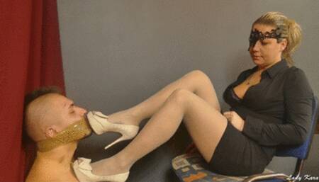 I taped my slave boy mouth and make him to smell my sweat feet. first i gave him my high heels to smell. i order him to breath deeply all the time to show me how much he loves his goddess. next he must smell all my odour from sweat grey pantyhose and then bare feet. you can see how much he love worship my sexy feet.